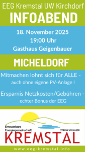 Wir bieten an diesem Abend die Möglichkeit sich direkt vor Ort bei der „EEG Kremstal UW Kirchdorf“ anzumelden. Dazu bitte Ihre aktuelle Stromrechnung und/oder die Einspeiseabrechnung mitnehmen!