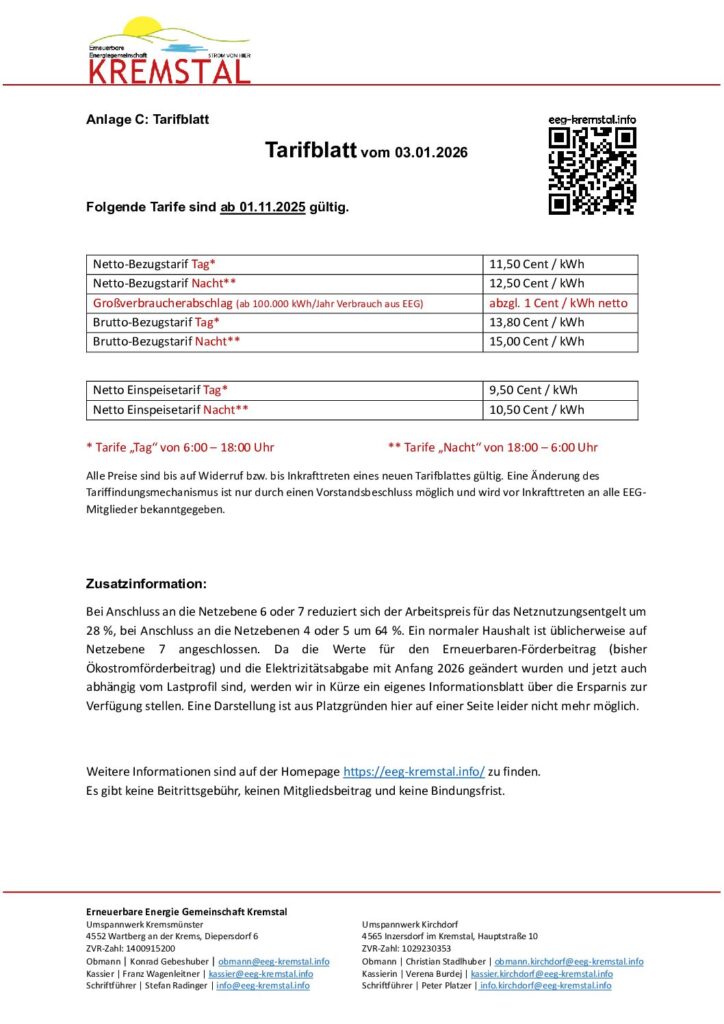 Folgende Tarife sind ab 01.1.2026 gültig.